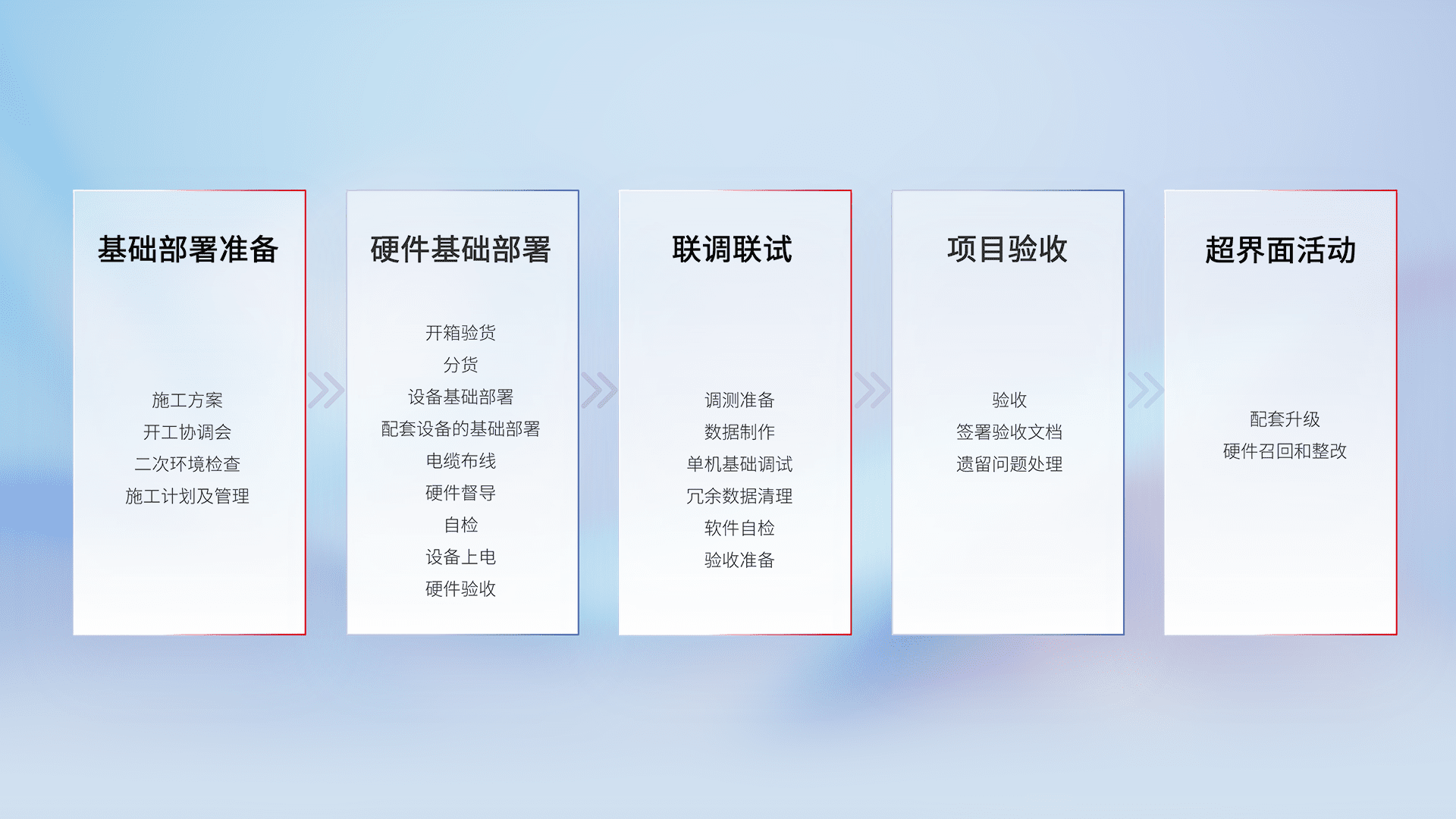 从基础部署准备、、、、硬件基础部署、、、、联调联试、、、、项目验收、、、、越界面活动的全过程可追溯,,,保证施工质量和进度。。。